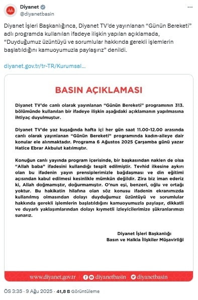 Diyanet İşleri Başkanlığı'nca, Diyanet TV’de yayınlanan “Günün Bereketi” adlı programda kullanılan ifadeye ilişkin yapılan açıklamada, “Duyduğumuz üzüntüyü ve sorumlular hakkında gerekli işlemlerin başlatıldığını kamuoyumuzla paylaşırız” denildi