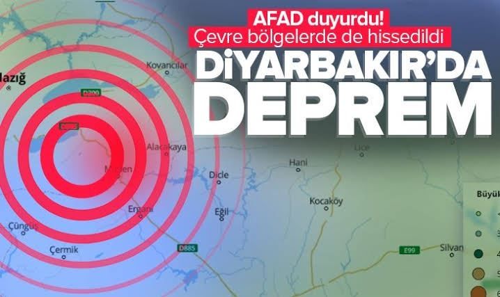 Diyarbakır'ın Hani ilçesinde saat 14.49'da bir deprem meydana geldi. Afet ve Acil Durum Yönetimi Başkanlığının (AFAD) internet sitesinde yer alan bilgiye göre, merkez üssü Hani ilçesi olan 4 büyüklüğünde sarsıntı kaydedildi.