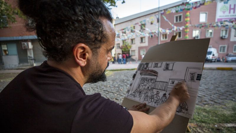 Artvin Çoruh Üniversitesi Sanat ve Tasarım Fakültesinden Dr. Öğr. Üyesi Kemal Sağlam, dağa kaçırılan çocukları için HDP İl Başkanlığı binası önünde oturma eylemi yapan Diyarbakır annelerinin eylemini tuvaline yansıttı.