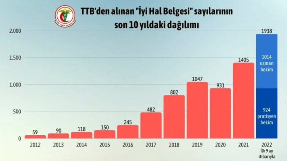 Sadece Eylül ayında 255 doktor yurtdışına gitmek için bu belgeyi istedi. 2021’de yurtdışına gitmek için TTB’den “İyi Hal Belgesi” isteyen doktorların sayısı ise 1405 olarak açıklanmıştı. Türk Tabipleri Birliği (TTB) İkinci Başkanı Doç. Dr. Ali İhsan Ökten, maaş iyileştirmelerine karşın artarak devam eden doktor göçünü Cumhuriyet’ten Dilan Ayırkan'a değerlendirdi.