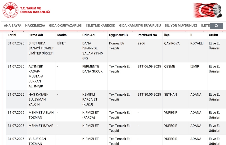 DOMUZ ETİ TESPİTİ Bakanlık, Düzce’de faaliyet gösteren bir yemek firmasının ürettiği rosto köftede domuz eti tespit edildiğini açıkladı. Bu durumun aslında 2021 yılında belirlendiği, ancak kamuoyuna geçtiğimiz günlerde duyurulduğu öğrenildi. KYK İHALELERİNDE YER ALMIŞ Söz konusu yemek firmasının, KYK yurt ihalelerinde de yer aldığı belirtiliyor. Bu durum, sosyal medya kullanıcıları tarafından büyük bir tepkiyle karşılandı. TEPKİLER ÇIĞ GİBİ Bakanlığın geç yapılan bu açıklaması, eleştirilerin artmasına neden oldu. Gıda güvenliğine yönelik endişeler, kamuoyunda daha fazla tartışılmaya başladı. Bu firmaları kaydedin, arısız sahte bal yemeyin! Tarım ve Orman Bakanlığı tarafından sahte bal ürettiği tespit edilen ve Denetle ekibimizin de daha önce gündeme getirdiği firmalar tam liste: – Hastürk Gıda – Hünkar Bal – Bereket Gıda – Koçhanoğlu – Kurt Orman Ürünleri – Mustafa ve Mehmet Sevilay Gıda – Zigana Mangal – Avarlar Gıda – Kevser Arıcılık – Yayla Balpınarı Gıda – Tufan AĞAÇCIOĞLU – Şeherli Gıda – BK Gıda-Ayşe TAVŞAN – Ankara Helvacısı – Sem-As Gıda – Hüsram Deva Bal Evi – Arıdağ Gıda Ve ArıcılıkAbdurrahman ÇİÇEK – Ağaçcı Ticaret-Hüseyin AĞAÇCI – KERVAN PARK – Balı Pınar – ER-FA Gıda – Petek Global Arıcılık – Enfa Gıda-Mustafa ENÇETİN – 06 Ekim Gıda – Şeherli Gıda – Kutlu AKİL – Seyyar Zeytin ve Zeytinyağı Ticareti – İsmail ŞİRİN – Ahmet AYKURT – Şanlı Bitkisel Çözümler – Doğal Anne Eli Kaş – Balveare Taklit, tağşiş ve hileli ürünlere ilişkin tüketiciyi bilgilendirmek amacıyla önemli bir uygulama hayata geçirildi. Bugünden itibaren yürürlüğe giren uygulamayla tüketicilerin sağlığını tehlikeye atan firmalar ve ürünler tek tek teşhir edilmeye başlandı. Yeni uygulamaya ilişkin konuşan Tarım ve Orman Bakanı İbrahim Yumaklı, Taklit, tağşiş ve hileli ürünler anlık olarak kamuoyuyla paylaşılacağını duyurdu.