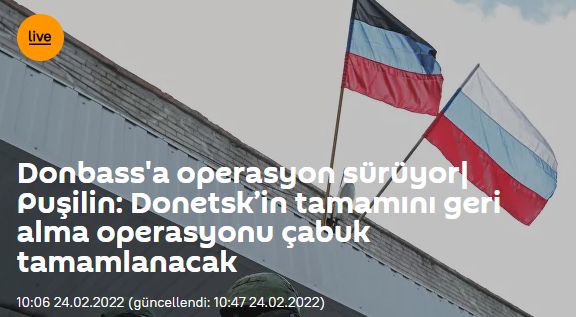 Rusya lideri Vladimir Putin de bu sabah yaptığı ulusa sesleniş konuşmasıyla Donbass'a askeri operasyon başlattıklarını duyurdu. "Rusya'nın NATO'nun genişletilmemesi konusunda bir uzlaşmaya varma girişimleri boşa çıkarıldı. İttifakın genişlemesiyle birlikte durum daha tehlikeli hale geliyor. Artık buna sessiz kalamayız" ifadelerini kullanan Putin, Ukrayna askerleri ve halkına da seslendi.