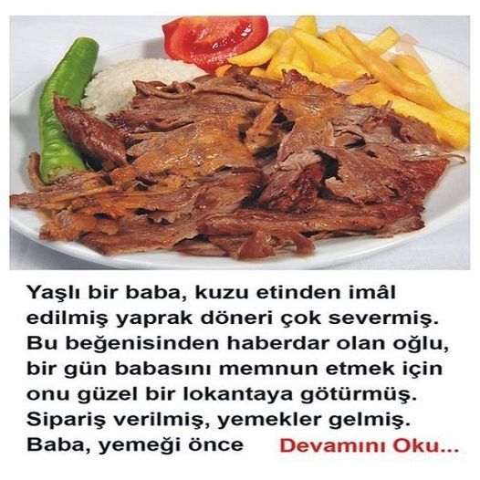 Yaşlı bir baba, kuzu etinden imâl edilmiş yaprak döneri çok severmiş. Bu beğenisinden haberdar olan oğlu, bir gün babasını memnun etmek için onu güzel bir lokantaya götürmüş. Sipariş verilmiş, yemekler gelmiş. Baba, yemeği önce kendisi yemek istemiş. Ancak yaşlılığın verdiği zayıflık sonucu elleri titrediği için lokmayı ağzına götürmek istediği her seferinde üzerine dökmüş, yağı sakalına damlamış. Lokantadaki insanların bakışları da pürdikkat onların üzerindeymiş. Aşağılayıcı bakışlar, alaycı tavırlar, surat ekşitmelerle arada bir yaşlı babaya bakıyorlarmış..