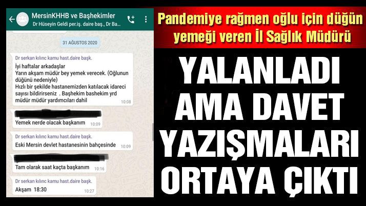 Corona virüsü salgınında her geçen gün ürkütücü gelişmelerin yaşandığı Mersin’de, evlenen oğlu için devlet imkanlarını kullanarak kamusal alanda düğün yemeği veren ancak bunu yalanlayan İl Sağlık Müdürü Sinan Bahçacı’ya tokat gibi cevap! Mersin Kamu Hastaneleri Birliği ve Başhekimler WhatsApp grubu yazışmalarında davetin KHB Daire Başkanı Serkan Kılınç tarafından yapıldığı, katılacakların isim ve sayı bildirmesi istendiği ortaya çıktı.