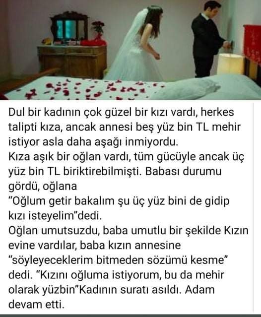 Dul bir kadının çok güzel bir kızı vardı, herkes talipti kıza, ancak annesi beş yüz bin TL mehir istiyor asla daha aşağı inmiyordu. Kıza aşık bir oğlan vardı, tüm gücüyle ancak üç yüz bin TL biriktirebilmişti. Babası durumu gördü, oğlana “Oğlum getir bakalım şu üç yüz bini de gidip kızı isteyelim”dedi.