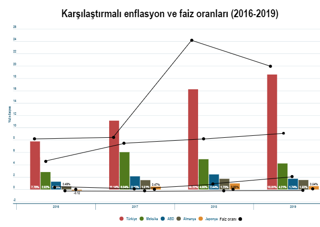 2017 yılında Türkiye'de yıllık enflasyon oranı yüzde 7,8 iken, bu rakam 2019 yılının ilk 7 ayında yüzde yaklaşık yüzde 19'a kadar çıktı. ABD, Japonya ve Almanya gibi diğer OECD ülkelerine bakıldığında Türkiye'deki enflasyon oranları büyük oranda artı.