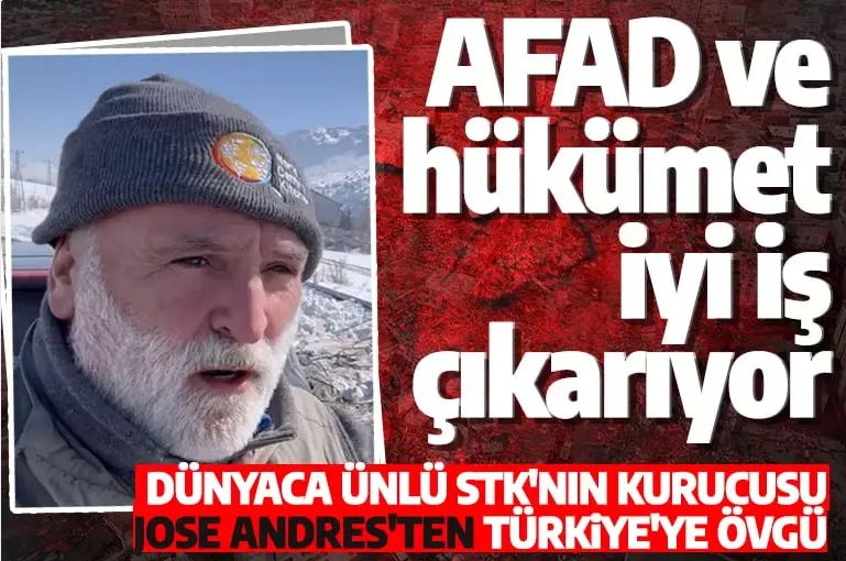 Asrın felaketi Kahramanmaraş merkezli 7.7 ve 7.6 büyüklüğündeki depremlerin ardındn dünyanın dört bir yanıdan Türkiye'ye maddi manevi destek geliyor. Doğal afetlerin ardından afetzedelere yiyecek sağlayan dünyaca ünlü World Central Kitchen'ın kurucusu şef Jose Andrés de depremzedelere yardım ediyor. Andres, Türkiye'deki depremlerle ilgili, 'Bir anda 20 deprem olmuş gibi bir şey bu. Biliyorum, bazıları devlet organize olmakta başarısız oldu diyor. Ama bence gayet iyi gidiyor.' dedi. Andrés AFAD'IN ve hükümetin harika iş çıkardığını söyledi.