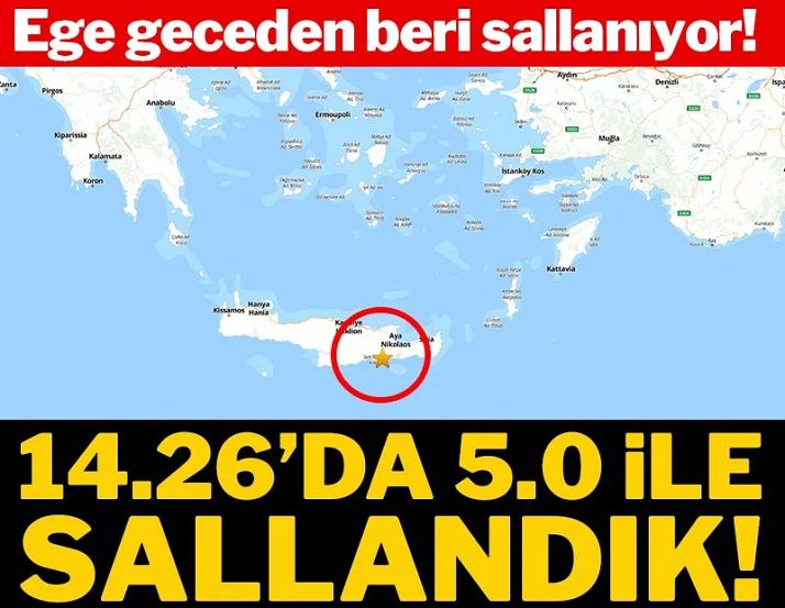 Ege Denizi'nde Girit Adası açıklarında 5.0 büyüklüğünde deprem meydana geldi.