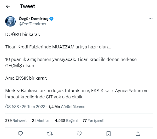 Ekonomist Özgür Demirtaş, Ticari Kredi Faizleri ile ilgili uyarıda bulundu. Demirtaş, “Ticari Kredi Faizlerinde muazzam artışa hazır olun. 10 puanlık artış hemen yansıyacak” dedi. Ünlü ekonomist Özgür Demirtaş, sosyal medya platformu Twitter’da Merkez Bankası’nın son düzenlemeleriyle ilgili değerlendirmede bulundu. Türkiye Cumhuriyeti Merkez Bankası geçen haftaki 250 baz puanlık faiz artışının ardından bugün parasal sıkılaşma sürecini destekleyecek seçici kredi ve miktarsal sıkılaştırma kararları açıkladı. Karar kapsamında kredi kartı nakit kullanımlarına ve kredili mevduat hesaplarına uygulanan aylık faiz oranı yüzde 2,89’a yükseltildi. Ayrıca yüzde 3 olan TL ticari krediler için aylık büyüme sınırının yüzde 2,5 olarak belirlenmesi yönünde karar verildi. MUAZZAM ARTIŞA HAZIR OLUN Konu ile ilgili değerlendirmede bulunan Demirtaş, şu ifadelere yer verdi: “Doğru bir karar: Ticari Kredi Faizlerinde muazzam artışa hazır olun… 10 puanlık artış hemen yansıyacak. Ticari kredi ile dönen herkese geçmiş olsun. Ama eksik bir karar: Merkez Bankası faizini düşük tutarak bu iş eksik kalır. Ayrıca Yatırım ve İhracat kredilerinde çıt yok o da eksik.”