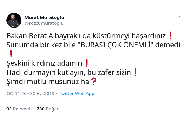 Espirili dili ile tanınan Sözcü gazetesi yazarı ekonomist Murat Muratoğlu toplantı sonrasında, "Bakan Berat Albayrak'ı da küstürmeyi başardınız,