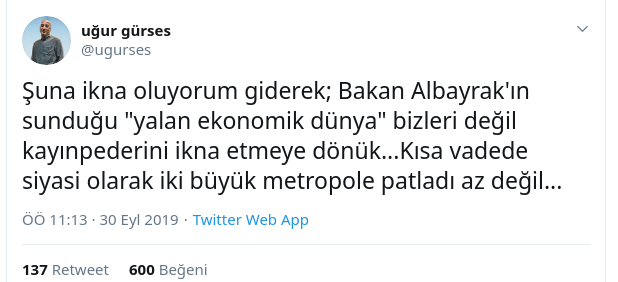 Ekonomist Uğur Gürses de planın elle tutulur bir yanı olmadığını belirtti. Gürses, "Şuna ikna oluyorum giderek; Bakan Albayrak'ın sunduğu "yalan ekonomik dünya" bizleri değil kayınpederini ikna etmeye dönük...Kısa vadede siyasi olarak iki büyük metropole patladı az değil..." tweetini paylaştı.