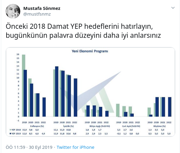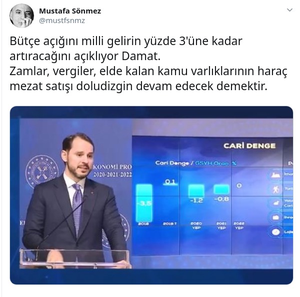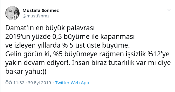 Sönmez ayrıca Ağaoğlu'nu kurtarma planının da ilan edildiğini belirtti. Sönmez, "Damat'ın YEP'inde, T. Varlık Fonu ile Ağaoğlu'ndan sonra enerji firmalarının ve KOİ yüklenicilerinin kurtarılacağı da açıklanmış oldu. Damat'ın en büyük palavrası 2019'un yüzde 0,5 büyüme ile kapanması ve izleyen yıllarda % 5 üst üste büyüme. Gelin görün ki, %5 büyümeye rağmen işsizlik %12'ye yakın devam ediyor!. İnsan biraz tutarlılık var mı diye bakar yahu:))" diye yazdı.