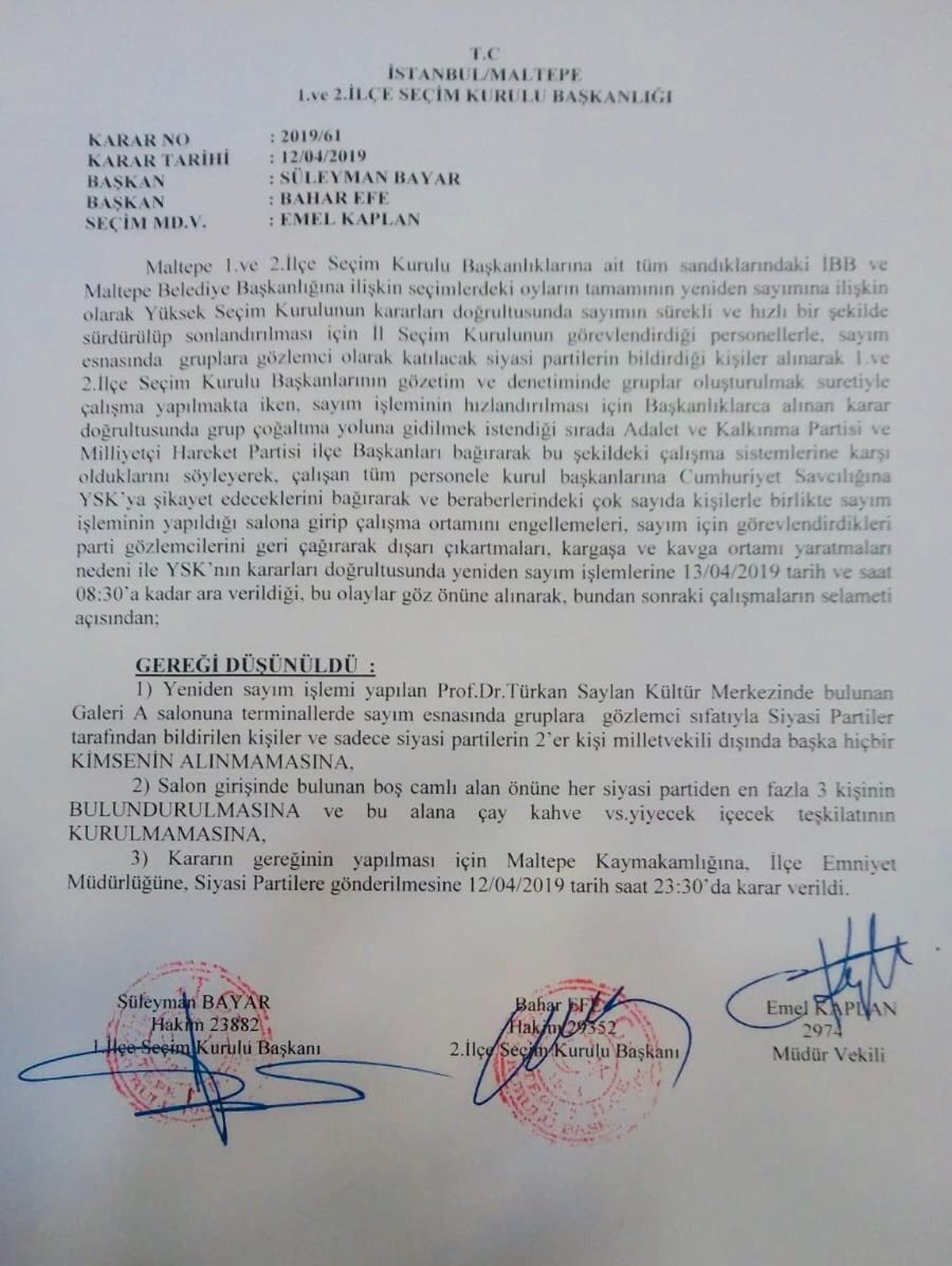 3) Kararın gereğinin yapılması için Maltepe Kaymakamlığına, İlçe Emniyet Müdürlüğüne, siyasi partilere gönderilmesine karar verildi” ifadelerine yer verilmişti.