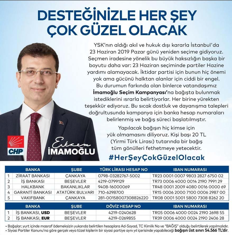 CHP, Ekrem İmamoğlu'nun başkan seçildiği ve YSK tarafından iptal edilen İstanbul seçimlerinde yeni kampanya döneminde kullanılmak üzere bağış kampanyası başlattı.