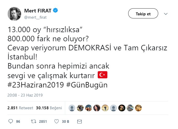 Tekrarlanan İstanbul seçimini Ekrem İmamoğlu'nun büyük bir farkla kazanmasının ardından çok sayıda ünlü isim de bu durumu sosyal medya hesaplarından yorumladı.