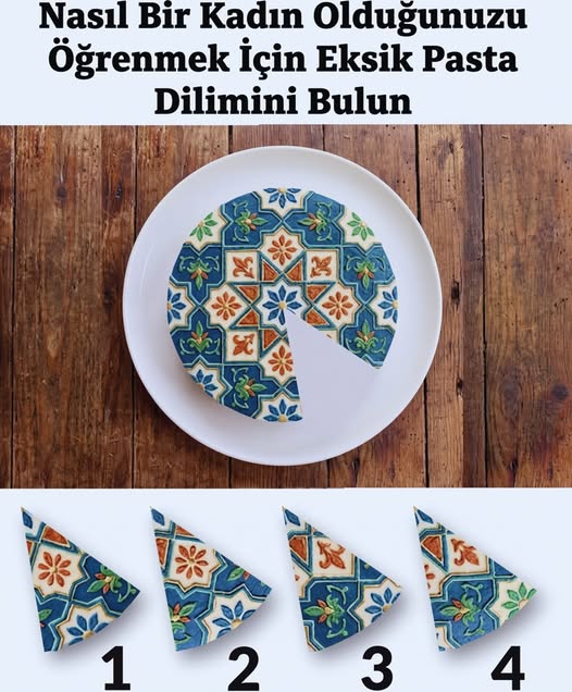 İlk bakışta, görsel bulmaca aldatıcı derecede basit görünüyor: bir dilimi eksik ve altında dört olası parça bulunan, güzelce süslenmiş bir pasta. Oysa bu kadar basit görünen bir görüntü bile kişilik hakkında ince ipuçları ortaya çıkarabilir. Bu tür görsel bulmacalar, gözlem becerilerinden daha fazlasını gerektirir.Bu tür yapımlar, içgüdüye, estetik tercihe ve kişisel karar verme eğilimlerine hitap ederek izleyicileri kalıpları nasıl fark ettiklerini, sonuçları nasıl tahmin ettiklerini ve görsel uyaranlara sezgisel olarak nasıl tepki verdiklerini düşünmeye teşvik eder. Temel görev, dört parçadan hangisinin pastanın eksik bölümünü en iyi şekilde tamamladığını seçmektir. Seçim keyfi gibi görünse de, psikologlar anlık seçimlerin kişilik özelliklerine ve düşünme tarzlarına işaret edebileceğini öne sürüyor. Bu egzersizin titiz bir bilimsel değerlendirmeden ziyade, eğlenceli bir kişilik testi olduğunu belirtmek önemlidir. Çekiciliği, merakı ve iç gözlemi teşvik edecek şekilde eğlenceyi, sezgiyi ve öz yansımayı birleştirmesinde yatmaktadır Cevap icin..