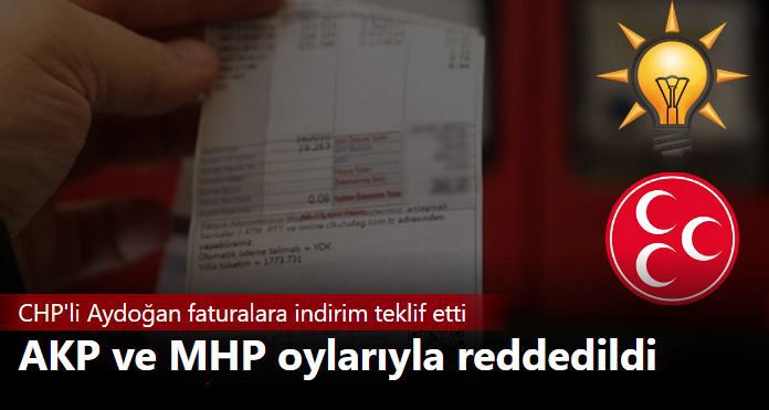 CHP İstanbul Milletvekili Turan Aydoğan’ın TBMM Genel Kurulu’na sunduğu, konutlar için yapılan elektrik, su, doğalgaz ve ısınma amaçlı diğer yakacak teslimlerinin katma değer vergisinden istisna tutulmasına yönelik kanun teklifi AKP ve MHP oylarıyla reddedildi.