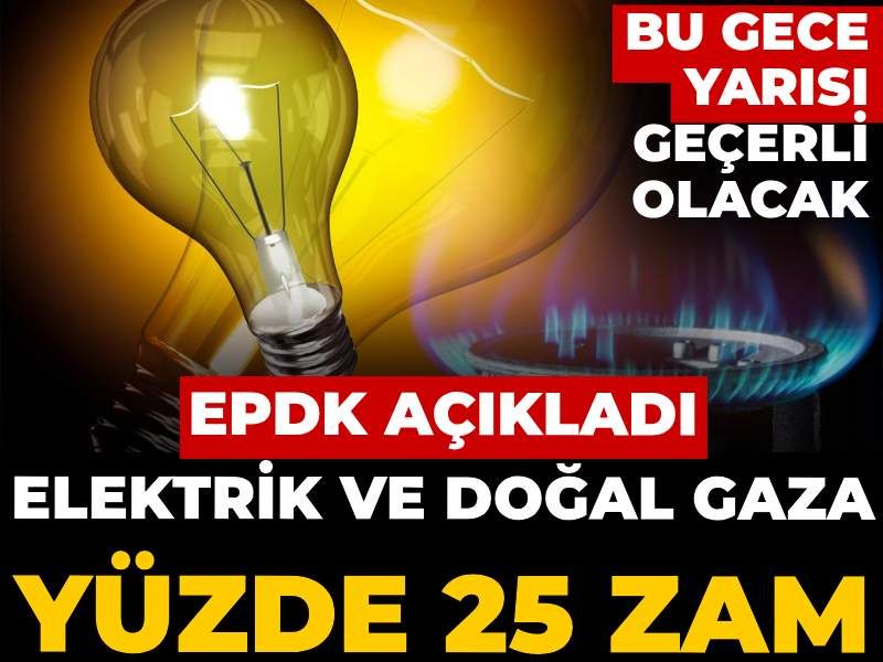 EPDK, elektrik ve doğal gaza bu gece yarısından itibaren geçerli olmak üzere yüzde 25 zam geldiğini açıkladı.
