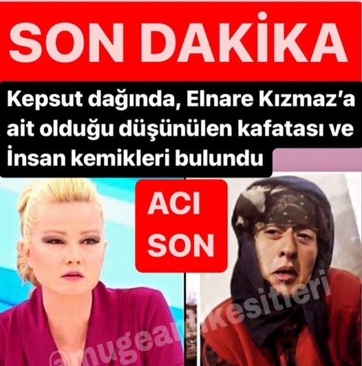 Cuma günü olayla ilgili Muge anli Muzaffer beyin gözaltına alındığını belirtmişti. Bugün malesef üzen haber geldi. Elnare kızmaya ait olduğu düşünülen kadın kafa taşı ve kol kemikleri birbirinden uzak olan yerlerde bulundu.