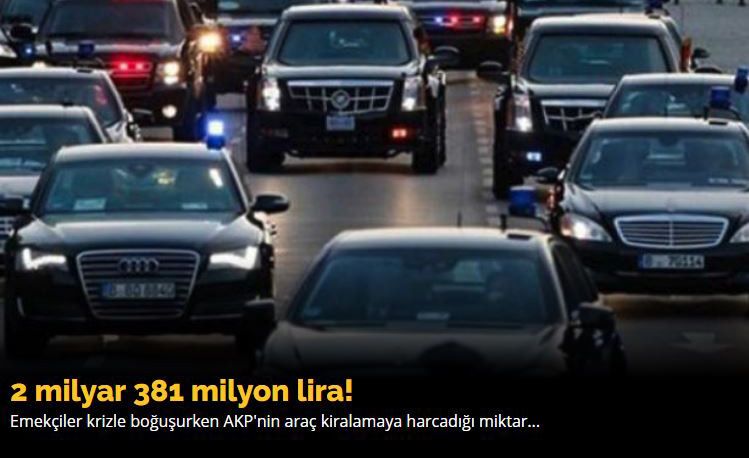 Son dönemde basına yansıyan AKP'nin araç kiralama haberlerinden sadece bir bölümü içeren bu giriş, emekçiler krizle boğuşurken AKP'nin araç saltanatının hangi boyutlara ulaştığını gözler önüne seriyor.