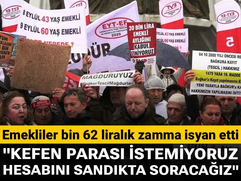 AKP'nin en düşük emekli aylığına uyguladığı bin 62 TL'lik artışa yurttaşların tepkisi sürüyor. İstanbul Bakırköy'de yağışlı havada bir araya gelen yüzlerce yurttaş zamma isyan ederek, "Sefaletin hesabını sandıkta soracağız" ifadelerini kullandı.