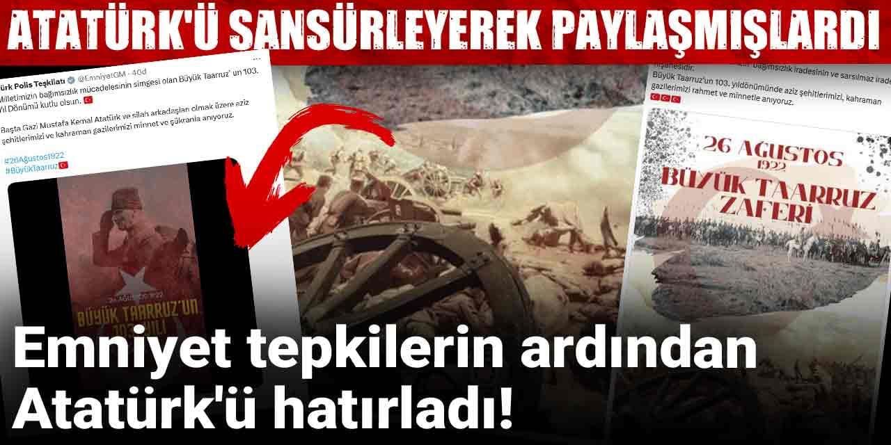 Tepkilerin ardından Emniyet Genel Müdürlüğü Atatürk'ün yer aldığı bir video paylaştı. Sosyal medya platformu X'ten bir video ile yeni bir paylaşım yapan Emniyet, "Milletimizin bağımsızlık mücadelesinin simgesi olan Büyük Taarruz’ un 103. Yıl Dönümü kutlu olsun. Başta Gazi Mustafa Kemal Atatürk ve silah arkadaşları olmak üzere aziz şehitlerimizi ve kahraman gazilerimizi minnet ve şükranla anıyoruz" ifadeleri yer aldı.