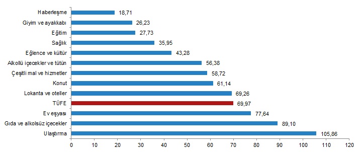 TÜİK'in verilerine göre bir önceki yılın aynı ayına göre artışın yüksek olduğu ana gruplar ise sırasıyla, %105,86 ile ulaştırma, %89,10 ile gıda ve alkolsüz içecekler, %77,64 ile ev eşyası oldu.