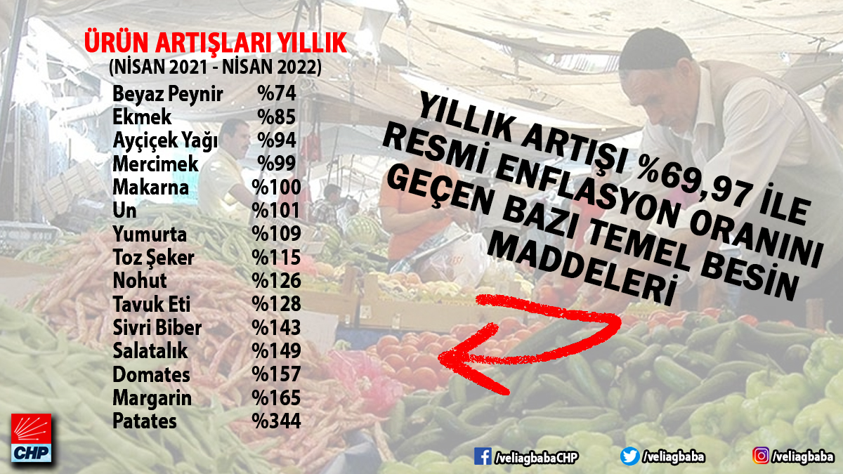 CHP Genel Başkan Yardımcısı ve CHP Emek Büroları Koordinatörü Veli Ağbaba ise TÜİK verilerine göre temel gıdalardaki 1 yıllık artışı paylaştı: