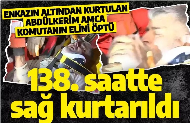 Yapılan çalışmalarda 138. saatte enkaz altında kalan Abdülkerim Amca ekiplerin yoğun çalışması sonucu kurtarıldı. Abdülkerim Amca'nın ailesinden 3 kişinin daha kurtarılmasına yönelik çalışmalar sürüyor.