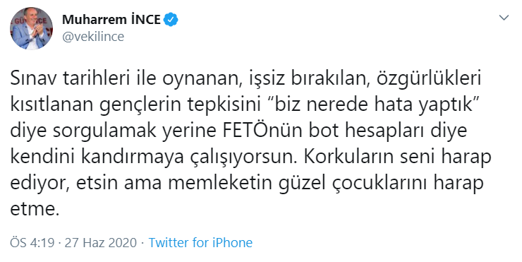 İnce, "'Biz nerede hata yaptık' diye sorgulamak yerine FETÖ'nün bot hesapları diye kendini kandırmaya çalışıyorsun. Korkuların seni harap ediyor, etsin ama memleketin güzel çocuklarını harap etme" dedi.