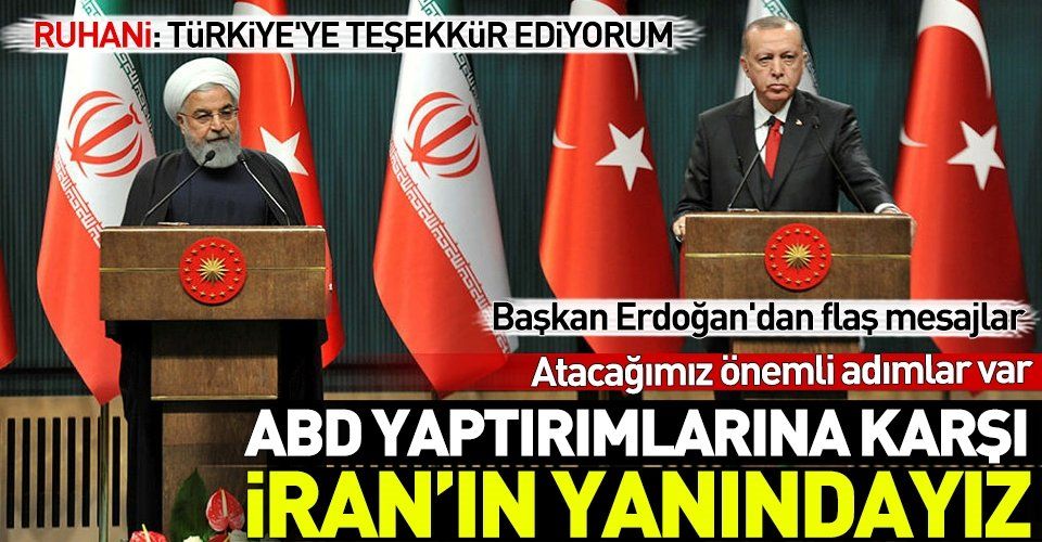 Cumhurbaşkanı Erdoğan, İran Cumhurbaşkanı Ruhani ile basın toplantısı düzenledi. Erdoğan açıklamasında, ABD yaptırımlarına karşı İran'ın yanında olduklarını belirtirken, Ruhani de 'Suriye’nin toprak bütünlüğü konusunda iki ülke aynı fikirdeyiz' ifadesini kullandı.