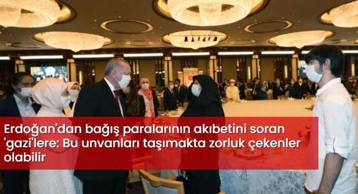 Erdoğan, sözlerinin devamında ise bazı kişilerin ‘şehit yakınlığı ve gazilik unvanlarını taşımakta zorluk çektiğini’ iddia ederek, iktidarı bağışlar konusunda protesto edenlere dönük üstü kapalı bir eleştiride bulundu. Erdoğan şunları söyledi: