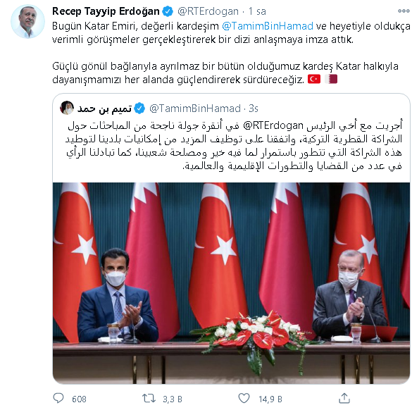 Cumhurbaşkanı Erdoğan, Twitter hesabından yaptığı paylaşımda, TürkiyeKatar Yüksek Stratejik Komite 6. Toplantısı'na katılmak üzere Türkiye'ye gelen Katar Emiri Şeyh Temim bin Hamed Al Sani ve heyetiyle verimli görüşmeler gerçekleştirerek bir dizi anlaşmaya imza attıklarını belirtti.