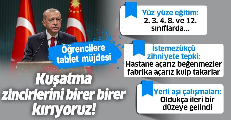 Sağlık önceliklerimizden taviz vermeyecek şekilde bu sıkıntıları da aşamalı olarak çözüme kavuşturacak yöntemler geliştiriyoruz. Eğitimde daha önce okul öncesi ve 1. sınıflarda yüzyüze eğitimi başlatmıştık. Bugün yüzyüze eğitimin kapsamını genişletme kararı aldık. İlkokul 1.sınıfların yanısıra 2. 3. ve 4. sınıflarda yüzyüze eğitimi belirlenen kurallar çerçevesinde başlatıyoruz. Ortaokul 8. lise 12. sınıflarda belirlenen kurallarla yüzyüze eğitime geçilecek.
