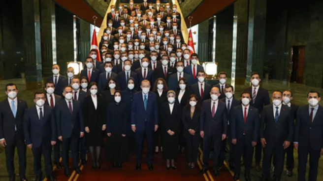 Söz konusu paylaşımda bir de fotoğraf vardı. Erdoğan'ın, kendisini ziyaret eden kaymakam adaylarıyla kabul salonunun merdivenlerinde çektirdiği "aile fotoğrafı" bilgilendirmeye eklenmişti.