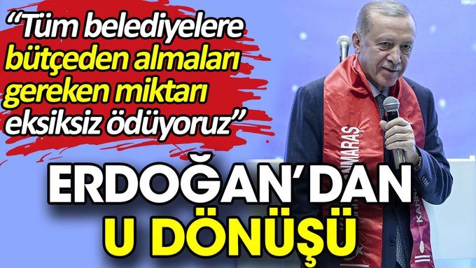 Cumhurbaşkanı Erdoğan, belediyelerle ilgili yaptığı açıklamada ‘U dönüşü’ yaptı. Erdoğan, “Tüm belediyelere bütçeden almaları gereken miktarı eksiksiz ödüyoruz” dedi.