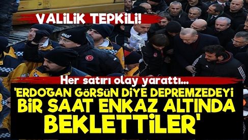 Elazığ depremi sonrası Tayyip Erdoğan, Mustafa Paşa Mahallesi'nde aramakurtarma çalışmalarının sürdüğü bir enkaza gelir. AFAD Müdahale Dairesi Başkanı Abdulkadir Tezcan enkaz başındaki ekiplere eliyle “Gönderin” işareti verir. Enkazdan çıkarılan yaralı, sedye üzerinde Erdoğan’ın yanına getirilir... KRT Tv'de gazeteci Serdar Akinan'ın anlattıkları yurttaşları şok etti. AFAD yetkilisi enkaz altındaki kadını 1 saat bekletiyor. Erdoğan oraya vardığında çıkartın talimatı veriyor ve kadın Erdoğan'ın yanına getiriliyor.