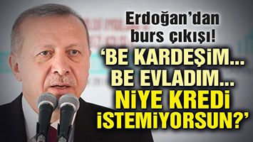 Erdoğan, öğrencilerin burs istediğine değinerek, “Be kardeşim, be evladım ya niye kredi istemiyorsun? Burs sayısı diyelim ki 150 bin, 160 bin ama krediyi kim müracaat ederse alabiliyor, geri çevirme yok. Ödemeye gelince zaten faiz diye bir şey yok. Sigortalı bir işe girdiğin zaman çok düşük taksitlerle ödeme yapacaksın. İş sahibi olmadan ‘Gel bu parayı öde.’ diye bir şey yok. Bu da bir nevi bursun aslında farklı bir görüntüsü” diye konuştu.