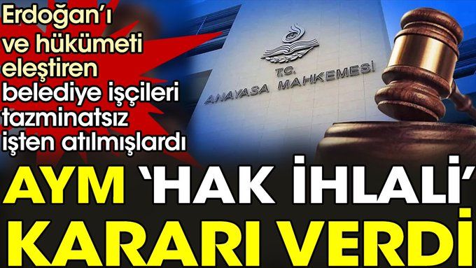 Anayasa Mahkemesi (AYM), Kocaeli Büyükşehir Belediyesi'nde görevli altı işçinin Cumhurbaşkanı Recep Tayyip Erdoğan ve hükümetini eleştiren paylaşımlar yaptığı gerekçesiyle tazminatsız işten atılmasına "hak ihlali" kararı verdi.