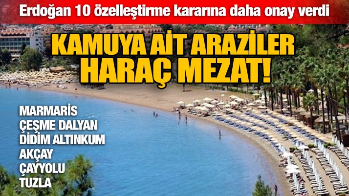 Türkiye’nin en değerli konumunda bulunan kamuya ait araziler, cennet koylar, eğitim ve dinlenme tesisleri özelleştirme kapsamında haraç mezat satılmaya devam ediyor. Cumhurbaşkanı ve AKP Genel Başkanı Erdoğan, birbirinden değerli 7 kamu arazisinin daha satışını onayladı. Erdoğan, özelleştirme kapsamındaki 3 ayrı taşınmazın satış öncesi imar planları değişikliğine de onay verdi.