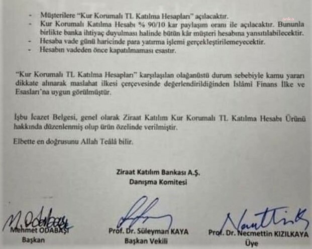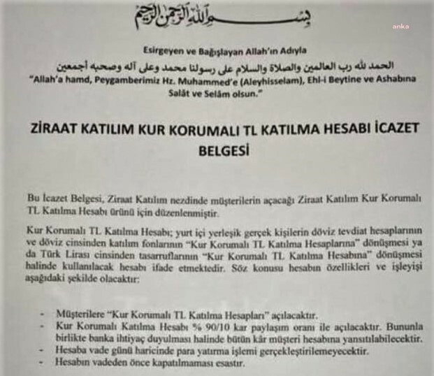 Kur Korumalı TL Katılım Hesabı için "İcazet Belgesi" alındı. Ziraat Katılım Bankası'nın ilahiyatçılardan oluşan Danışma Komitesi’nin düzenlediği “İcazet Belgesinde”, "‘Kur Korumalı TL Katılma Hesapları’ karşılaşılan olağanüstü durum sebebiyle kamu yararı dikkate alınarak maslahat ilkesi çerçevesinde değerlendirildiğinden İslami Finans İlke ve Esasları’na uygun görülmüştür" denildi. Maslahat, “İş, önemli iş, mesele” anlamına geliyor.