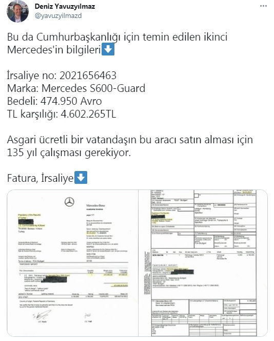 CHP'li Deniz Yavuzyılmaz sosyal medya üzerinden Cumhurbaşkanlığı makam aracının faturasını paylaşan Yavuzyılmaz, "Asgari ücretli bir vatandaşın bu aracı satın alması için 135 yıl çalışması gerekiyor" dedi.