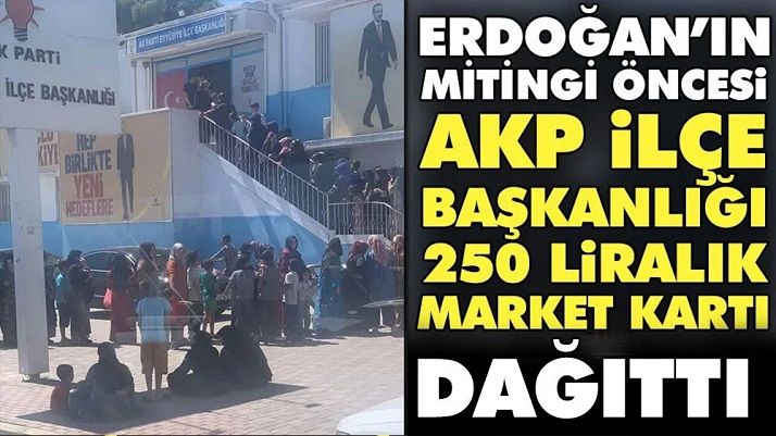 AKP Şanlıurfa Eyyübiye İlçe Başkanlığı önünde uzun kuyruklar oluştu. Urfa.com’da yer alan habere göre yüzlerce insanın sıcağın alnında ilçe başkanlığı önünde kuyruklar oluşturmasının sebebi ise 250 liralık market alışveriş kartı dağıtmaları oldu.