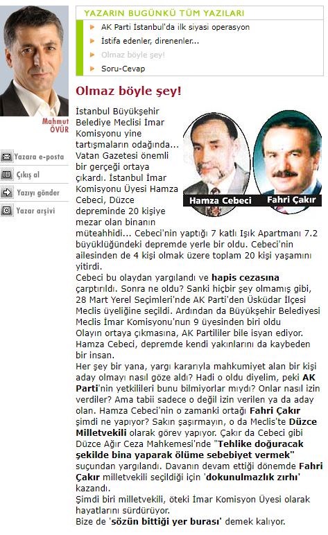 Övür’ün yazısında, "Hamza Cebeci'nin o zamanki ortağı Fahri Çakır şimdi ne yapıyor? Sakın şaşırmayın, o da Meclis'te Düzce Milletvekili olarak görev yapıyor. Çakır da Cebeci gibi Düzce Ağır Ceza Mahkemesi'nde ‘Tehlike doğuracak şekilde bina yaparak ölüme sebebiyet vermek’ suçundan yargılandı. Davanın devam ettiği dönemde Fahri Çakır milletvekili seçildiği için 'dokunulmazlık zırhı' kazandı. Şimdi biri milletvekili, öteki İmar Komisyon Üyesi olarak hayatlarını sürdürüyor. Bize de 'sözün bittiği yer burası' demek kalıyor" dediği görüldü.