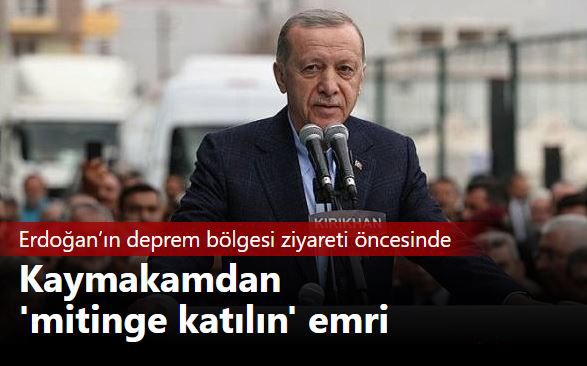 Diken'in haberine göre, dün Kırıkhan Stadyumu yanındaki çadır kenti ziyaret eden Erdoğan ve Bahçeli için kaymakamlık tarafından kamu personeline şöyle ‘emir’ gitti: