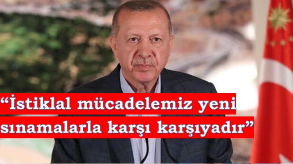 Bu kadim toprakların binlerce yıldır insanlığı bağrında yaşattığını, pek çok medeniyete ev sahipliği yaptığını anlatan Erdoğan, "Yaklaşık bin yıldır bu topraklarda her kökenden, her dilden, her kültürden insanın ortak bir hayali, ortak bir hedefi vardır. Bu hedef hep birlikte güven, huzur, refah içinde kardeşçe yaşamaktır. Millet olarak hepimizin yüreğinde yaşayan bu ortak hedefi terör dahil her yolu deneyerek engellemeye çalıştılarsa da hamdolsun başaramadılar. Malazgirt'ten İznik'e, Edirne'den İstanbul'a uzanan son devletimiz Türkiye Cumhuriyeti'nin kuruluşuyla günümüze kadar ulaşan istiklal ve istikbal mücadelemiz bir süredir yeni sınamalarla karşı karşıyadır." diye konuştu.