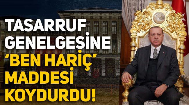 Erdoğan, kamu kurum ve kuruluşlarının harcamalarında tasarruf sağlanması, bürokratik işlemlerin azaltılması ve kamu kaynaklarının etkili, ekonomik ve verimli kullanımına ilişkin "tasarruf tedbirleri" genelgesi yayımladı. Resmi Gazete'de yayımlanan tasarruf genelgesindeki bir ayrıntı dikkat çekti.Erdoğan, 'Tasarruf Tedbirleri' konulu genelgede 'Cumhurbaşkanlığı İdare İşleri ve TBMM Genel Sekreterliği'ni muaf tuttu.Genelgeye göre kamu kurumlarında 2020 yılındaki taşıt sayıları, 2023 sonuna kadar en az yüzde 20 oranında azaltılacak. Kamu kurum ve kuruluşlarının basını izleme ile ilgili birimleri ve kütüphane dokümasyon merkezleri hariç hiçbir şekilde günlük gazete alımı yapılmayacak.