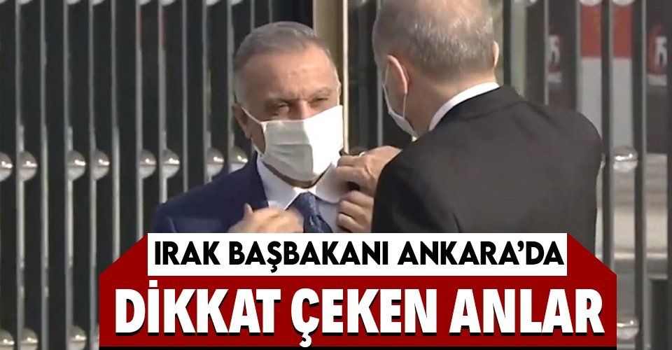Erdoğan, Kazimi'yi aracından inerken karşılarken, asker selamlamadan önce Irak Başbakanı'nın kıyafetlerini düzeltmesine yardımcı oldu.
