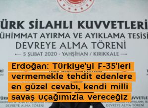 - Türkiye'yi F35'leri vermemekle tehdit edenlere en güzel cevabı, kendi milli savaş uçağımızla vereceğiz. Tasarımından üretimine her aşamada yerli olacak savaş uçağımızı inşallah 2023'te hangardan çıkaracağız.