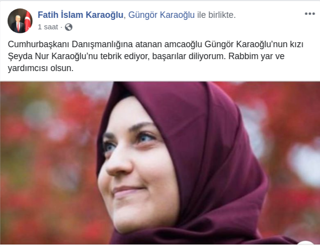 Cumhurbaşkanı Danışmanlığına Şeyda Nur Karaoğlu getirildi. Karaoğlu; 2011 – 2014 yılları arasında Londra Üniversitesi'nde bulundu. Ardından Harvard Üniversitesi, Jean Monnet Fransız Lisesi ve Colombia Üniversitesi'nde eğitim görmüştür. Şeyda Nur Karaoğlu Pazarlama Uzmanı olarak biliniyor. George Washington Üniversitesi'nde 2018 yılında İslamafobi üzerine çalıştığı belirtiliyor.
